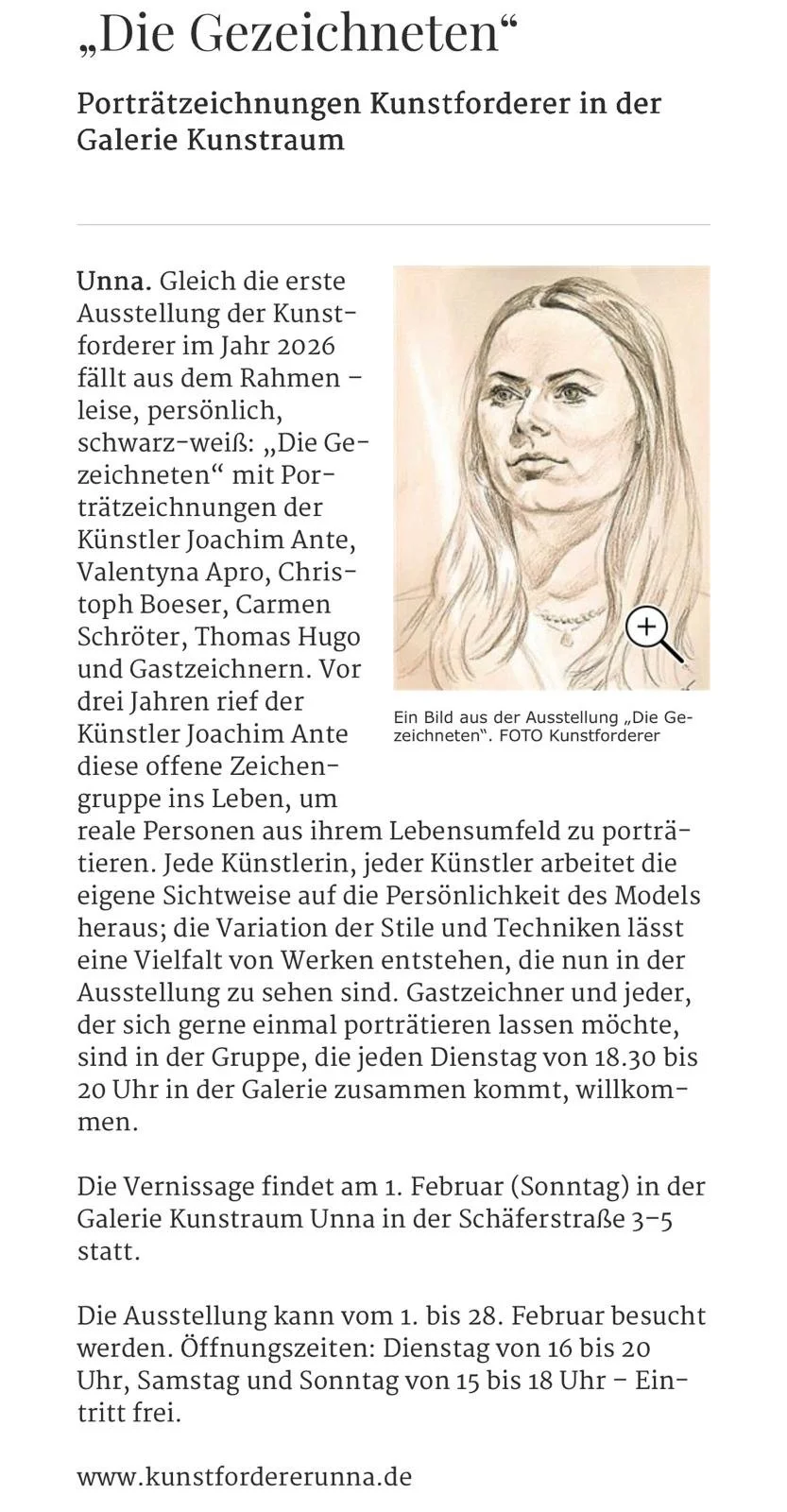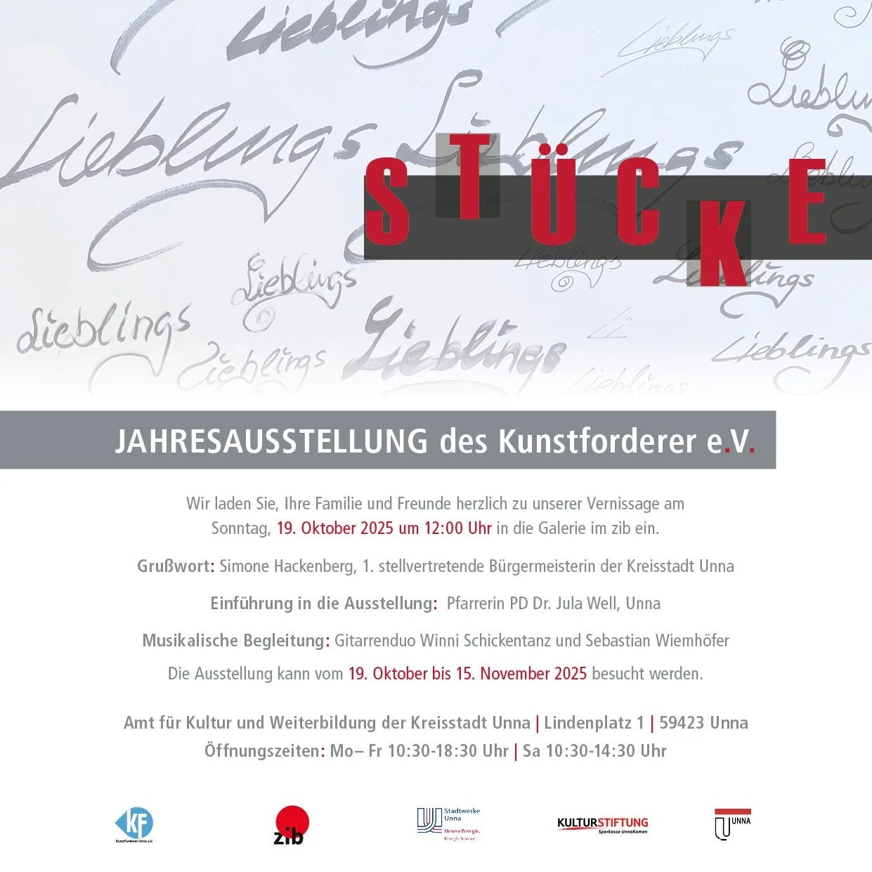 Bis dahin gibt es die Möglichkeit, aktuelle Kunstwerke der Kunstforderer in unserer Galerie im “Kunstraum Unna” zu Besichtigen. Diese befindet sich in der Schäferstraße. Wir würden uns über einen Besuch freuen.